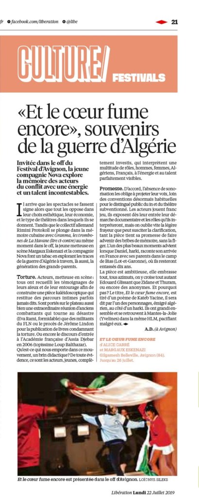 Dans sa double page Culture/festivals du 22 juillet, Libération sous la plume de Anne Diatkine Envoyée spéciale à Avignon consacre un article au second volet d’écrire en pays dominé .