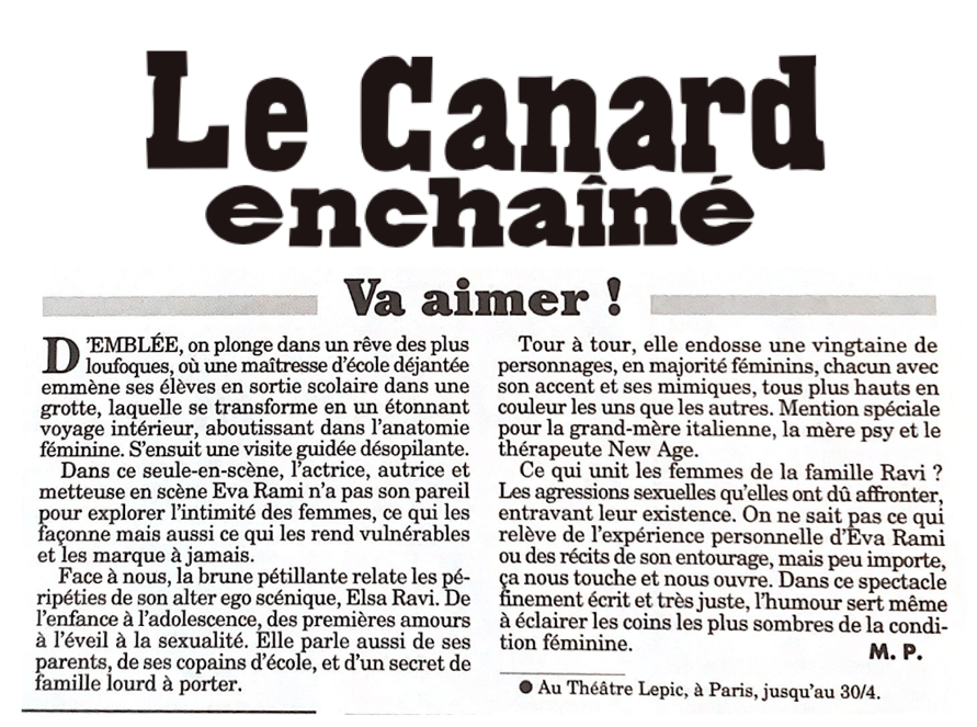 « Eva Rami alterne avec talent confessions poignantes et personnages truculents.Un seul-en-scène marquant, intense et parfaitement maîtrisé »