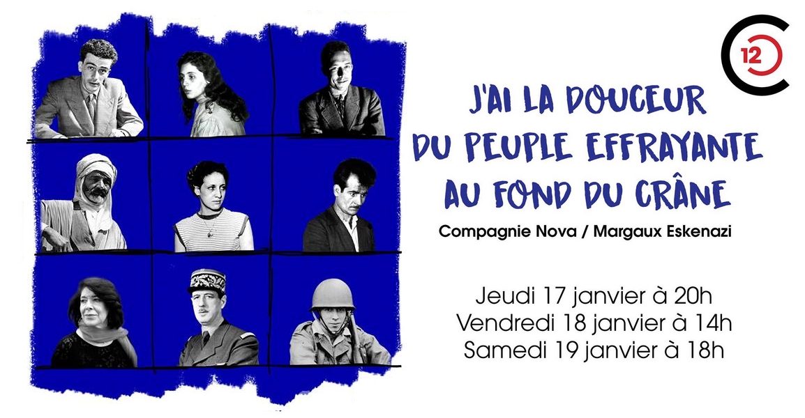 Organisé par Collectif 12 La Compagnie Nova / Margaux Eskenazi Du 17 au 19 janvier 2019 au Collectif 12 Théâtre. À partir de 14 ans. Durée 2h J’ai la douceur du peuple effrayante au fond du crâne est le second volet d’une investigation théâtrale sur les écritures de la décolonisation pour penser nos identités françaises …